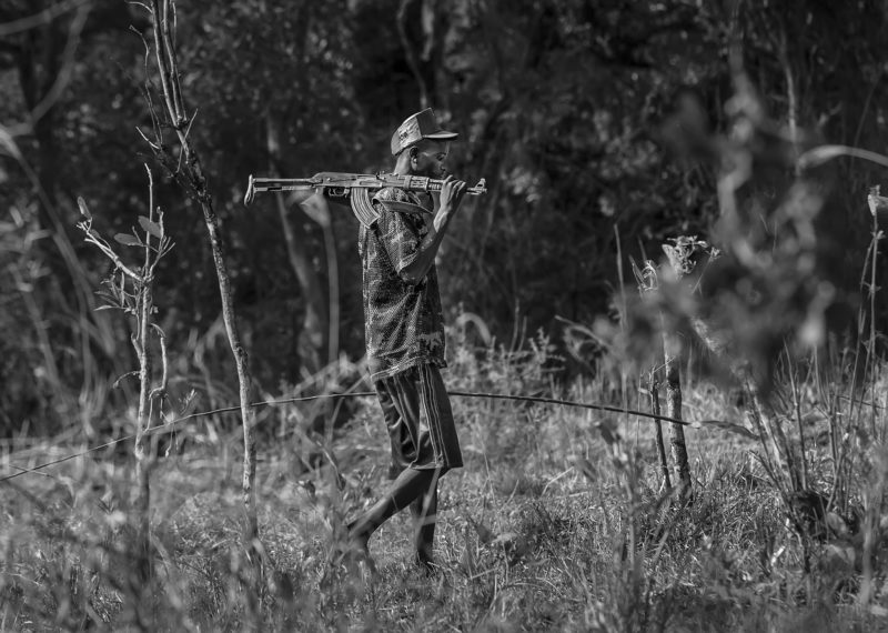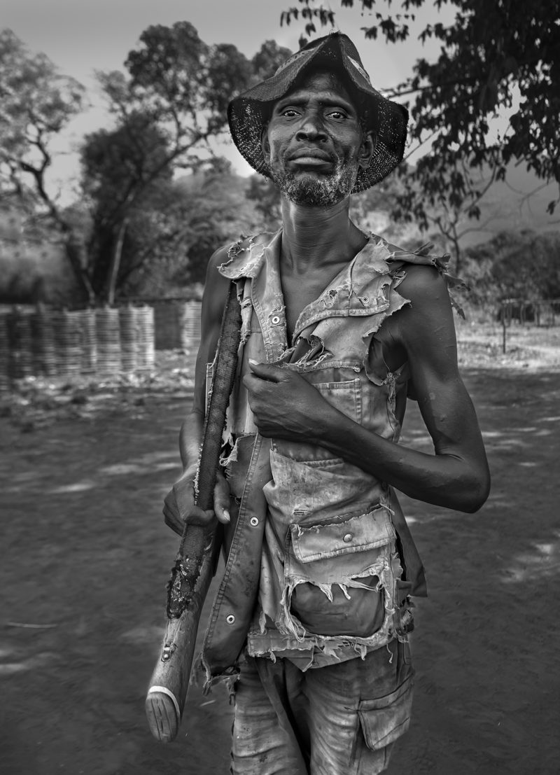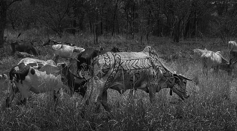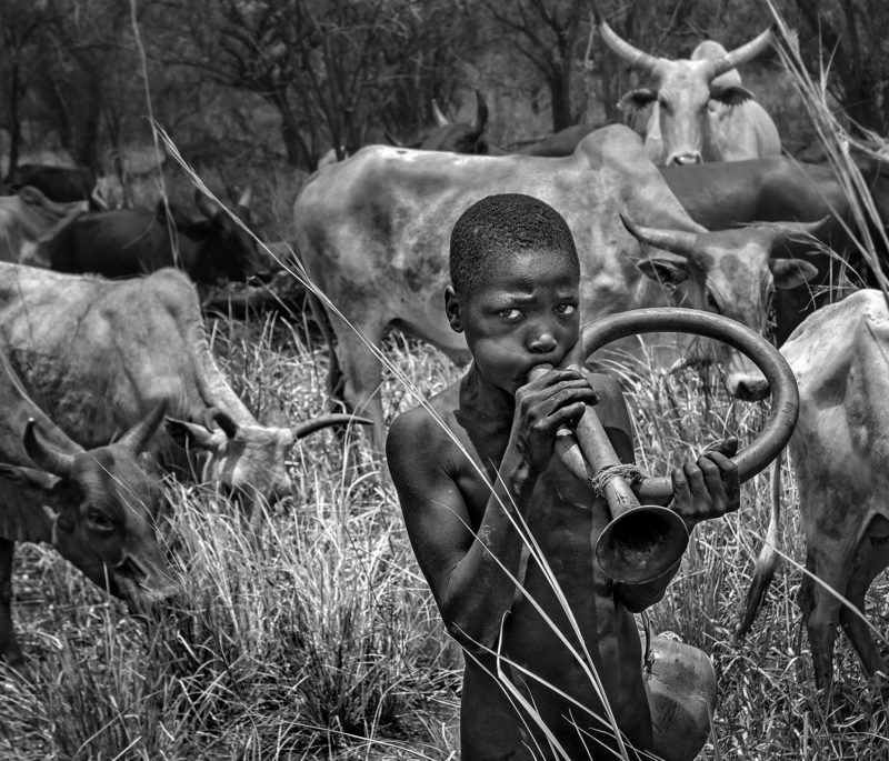 Casi llegando a la aldea nos encontramos con un grupo de muchachos, todos armados con escopetas Kalashnikov para defensa de sus animales, algunos serios, poco amigables en un primer momento y gracias a la comunicación de nuestro intérprete, hizo que nos aceptaran sin reparos. Arreaban sus vacas sagradas hacia la aldea, recorriendo zonas de pastizales fértiles. Eran guerreros DIDINGA, armados, muy flacos, muy pobremente vestidos, ropa hecha girones, con gorras militares y botas. Tomé fotos del grupo y de sus animales, algunos tatuados, con diseños hermosos. Había un chico que hacía sonar una corneta conectada a una manguera, era el llamador de los animales.