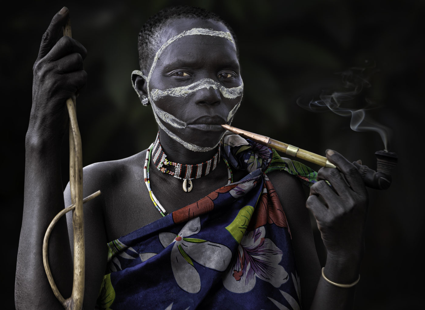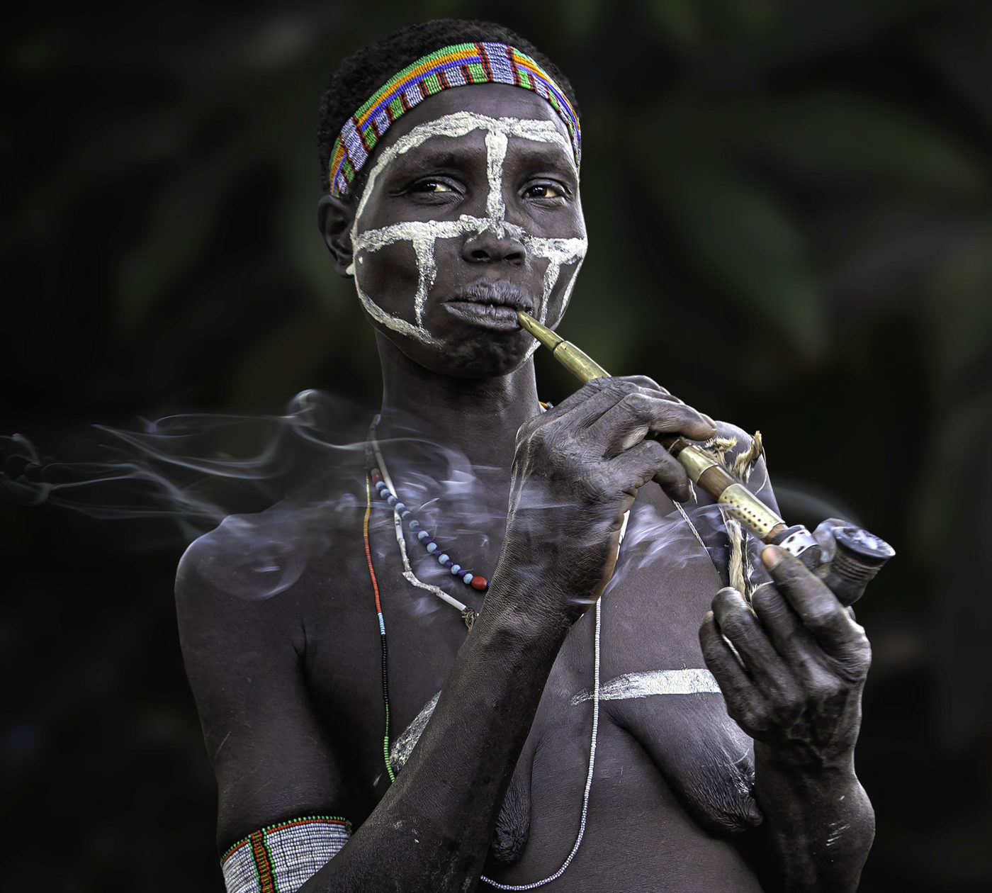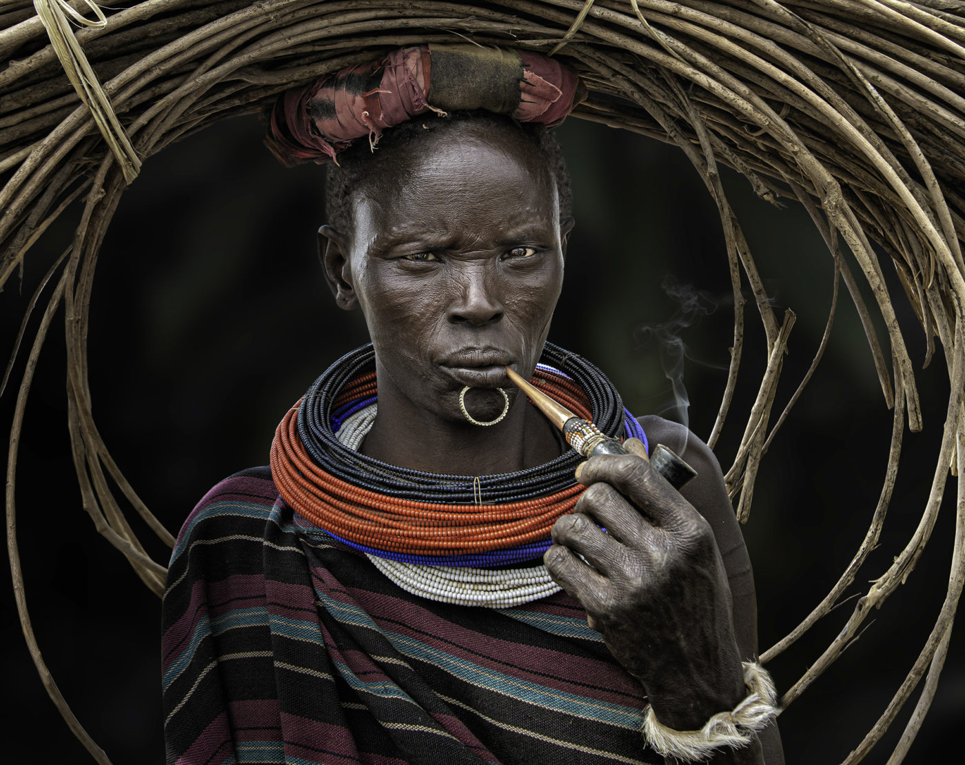 Presento here a un grupo de mujeres guardianas de la historia oral de su pueblo, han resistido décadas de guerra y conflictos tribales. Sus tradiciones son transmitidas de generación a generación, son las líderes de sus tribus, se encargan de la crianza de sus hijos, de armar y reparar sus chozas, de ir a buscar agua al pozo para la familia y para los animales, de cocinar para chicos y adultos de la comunidad. Fuman tabaco, costumbre milenaria que marca su estirpe, su identidad y orgullo tribal. Sus largas pipas son artesanalmente talladas en madera y decoradas con chapas y cuentas. Ellas se adornan también, no solo para las fiestas o ceremonias, con piercings labiales, collares de múltiples colores y según la tribu también escarifican su cuerpo como rasgo de belleza y de pertenencia.