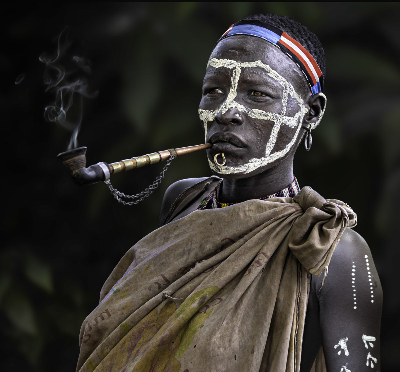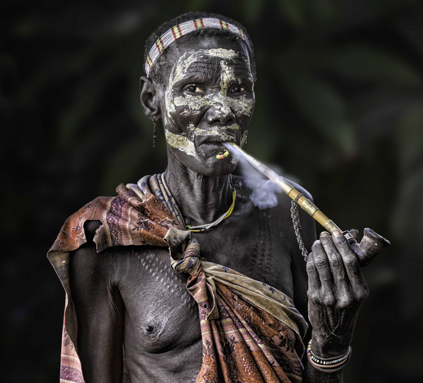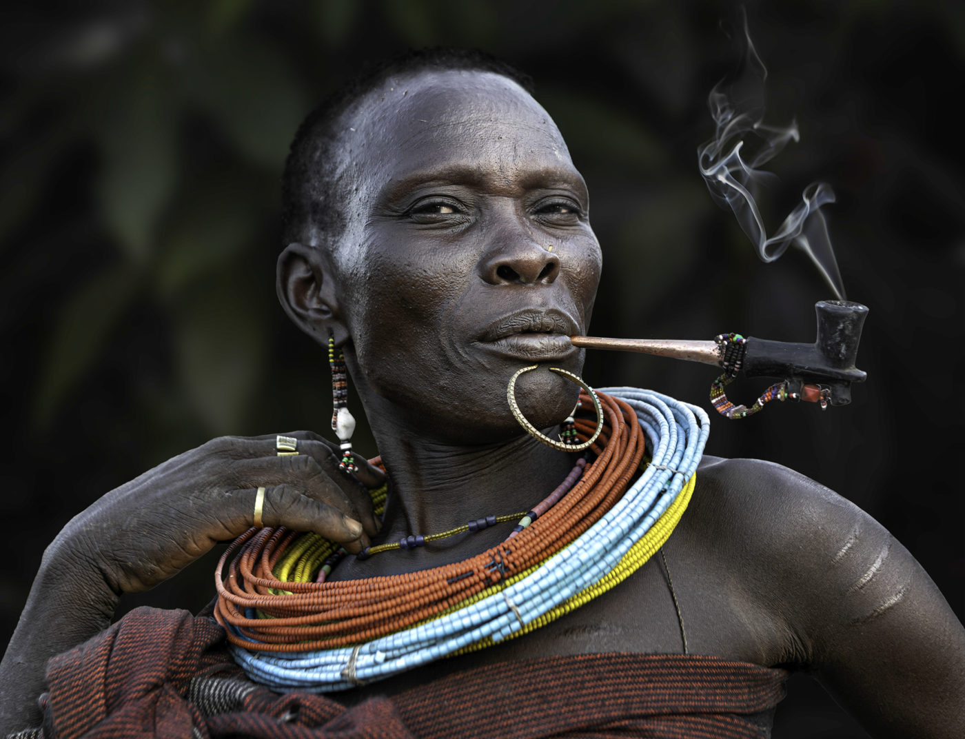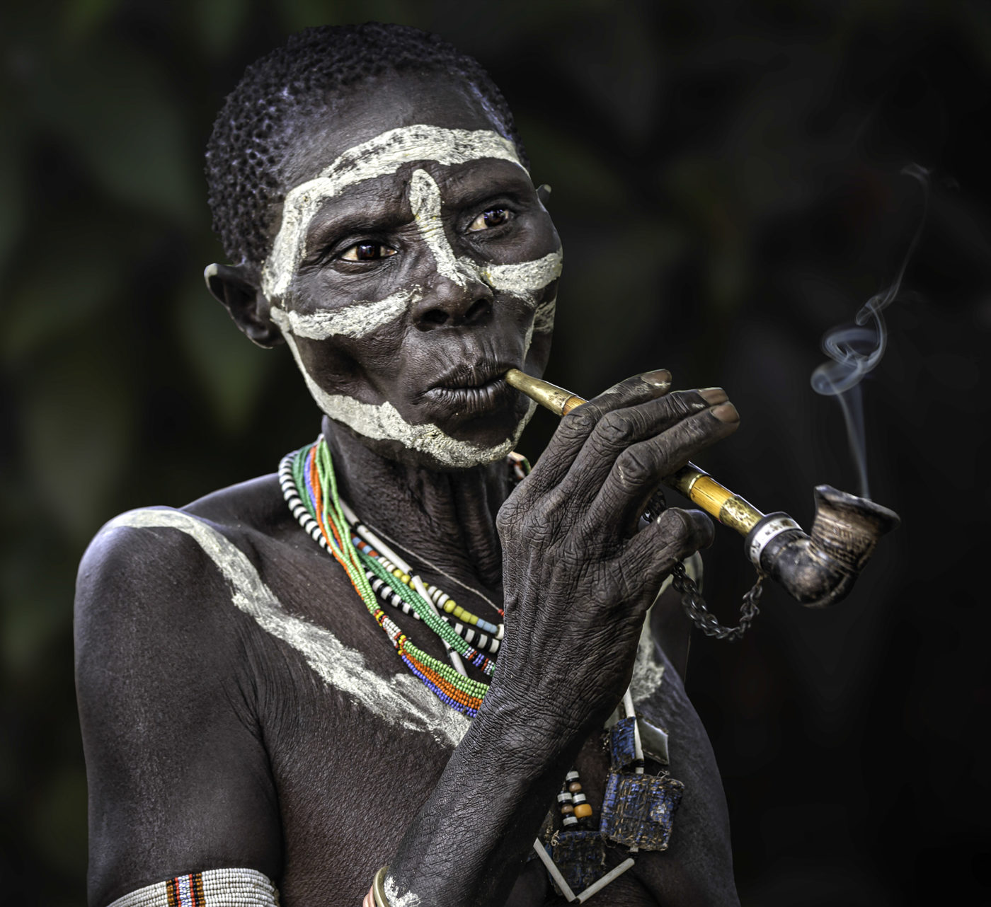 Presento here a un grupo de mujeres guardianas de la historia oral de su pueblo, han resistido décadas de guerra y conflictos tribales. Sus tradiciones son transmitidas de generación a generación, son las líderes de sus tribus, se encargan de la crianza de sus hijos, de armar y reparar sus chozas, de ir a buscar agua al pozo para la familia y para los animales, de cocinar para chicos y adultos de la comunidad. Fuman tabaco, costumbre milenaria que marca su estirpe, su identidad y orgullo tribal. Sus largas pipas son artesanalmente talladas en madera y decoradas con chapas y cuentas. Ellas se adornan también, no solo para las fiestas o ceremonias, con piercings labiales, collares de múltiples colores y según la tribu también escarifican su cuerpo como rasgo de belleza y de pertenencia.